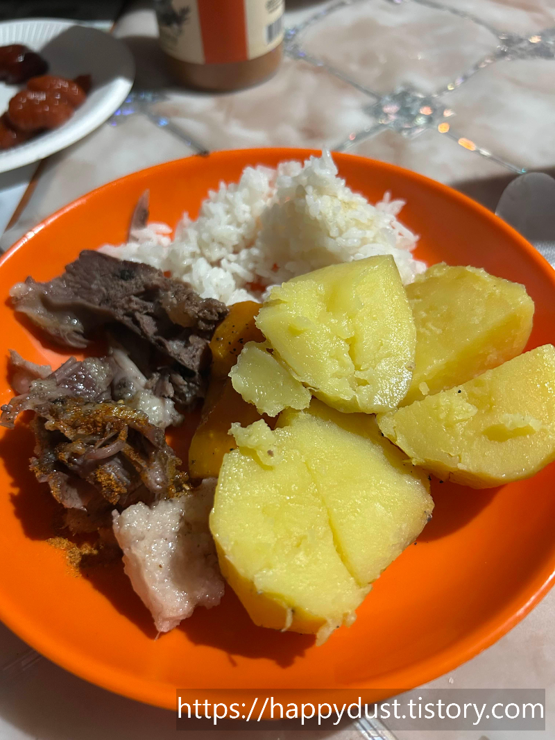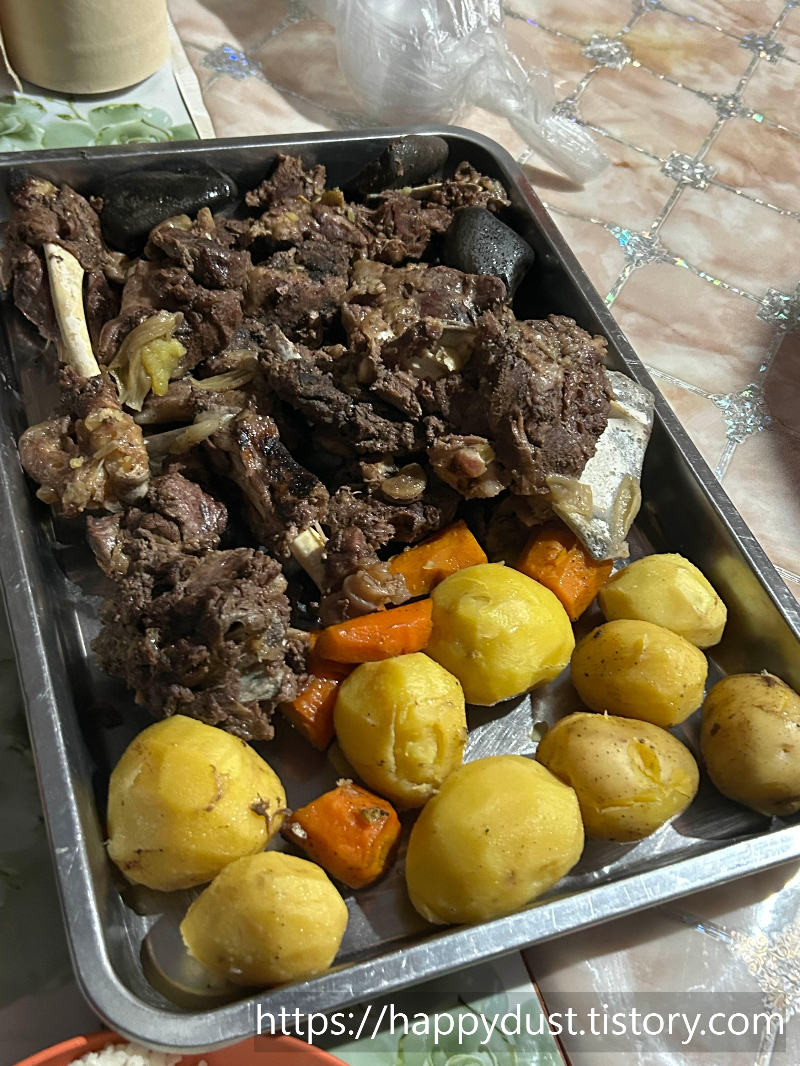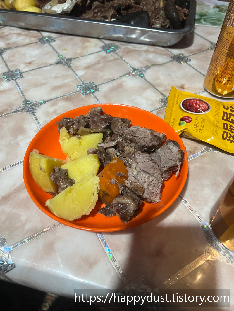 뜨거운 돌을 이용해 찌는 요리라 고기와 돌이 섞여있었는데 비주얼이 뭔가 생소하달까