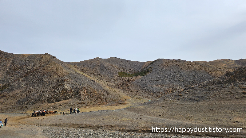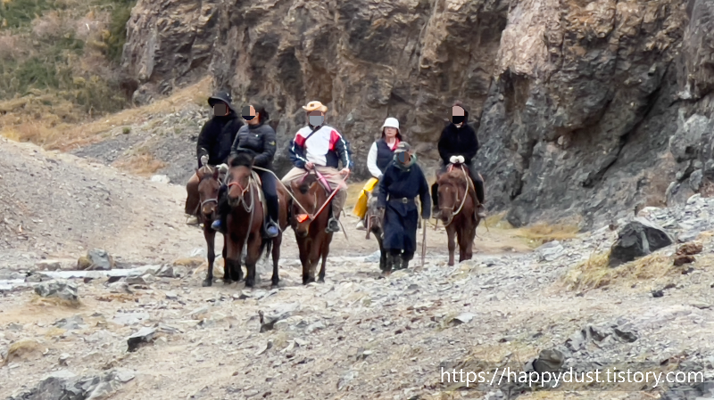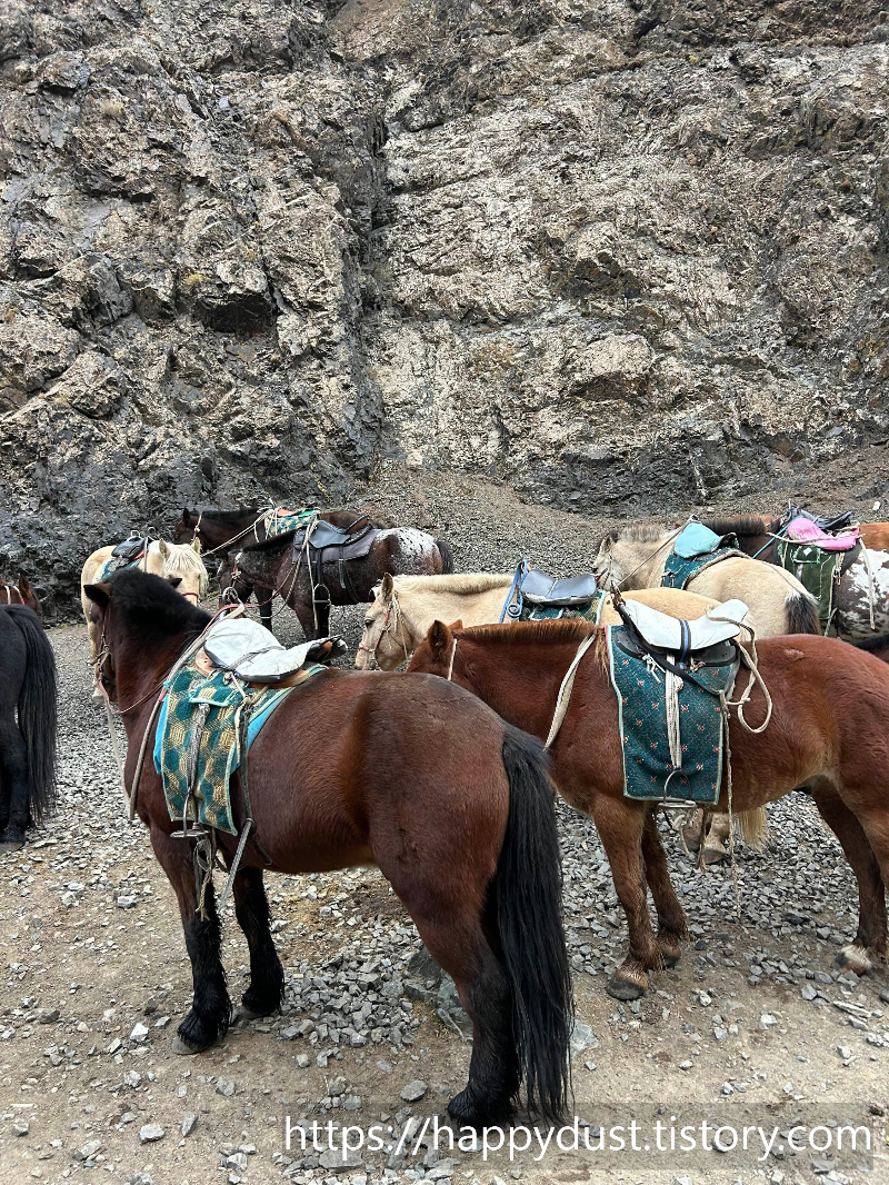 말타고 한참 들어가다가 일정구간 이상으로는 걸어가야한다고하여 말을 잠시 묶어놓고 걷기로했다