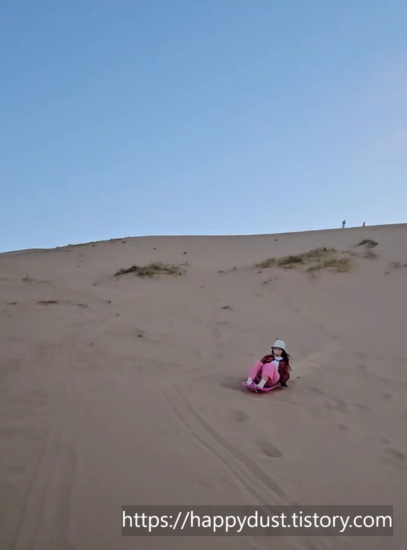 모래언덕 꼭대기에서 썰매를 타고 내려가려는데 생각보다 언덕 높이가 꽤 높게 느껴졌다