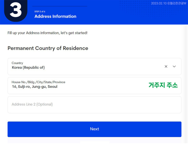 ③ STEP 2 of 6. Permanent Country of Residence: 거주지 주소 입력