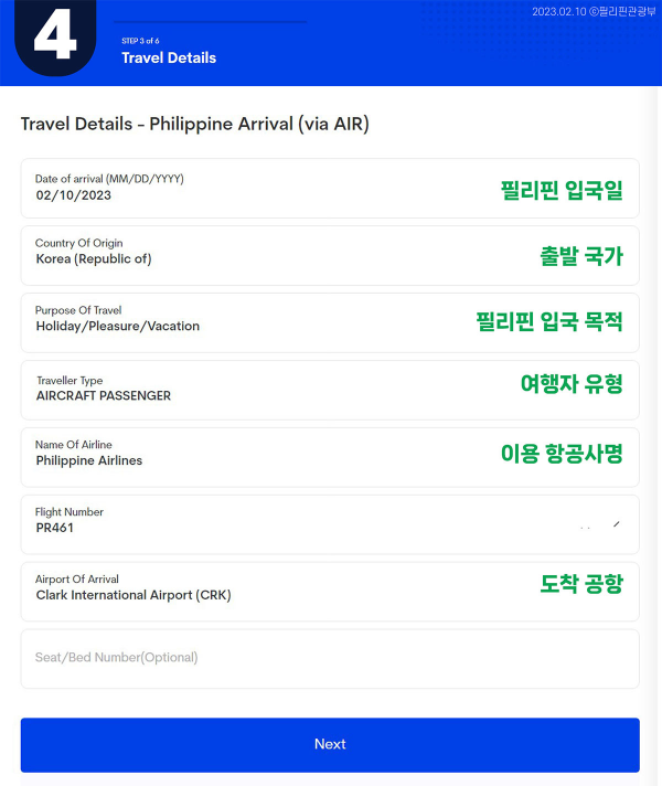 ④ STEP 3 of 6. Travel Details - Philippine Arrival (via AIR): 필리핀 입국 목적 및 항공편명, 이용 공항 입력