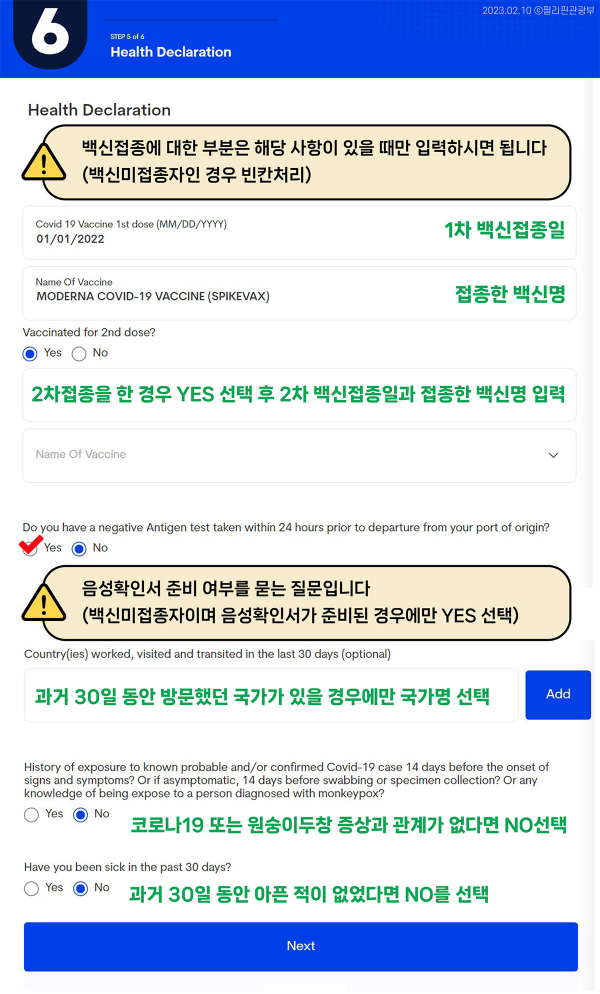 ⑥ STEP 5 of 6. Health Declaration: 백신접종 이력 입력. 건강상태 확인