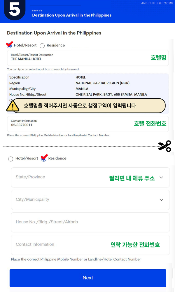 ⑤ STEP 4 of 6. Destination Upon Arrival in the Philippines: 필리핀 내 체류 주소 입력