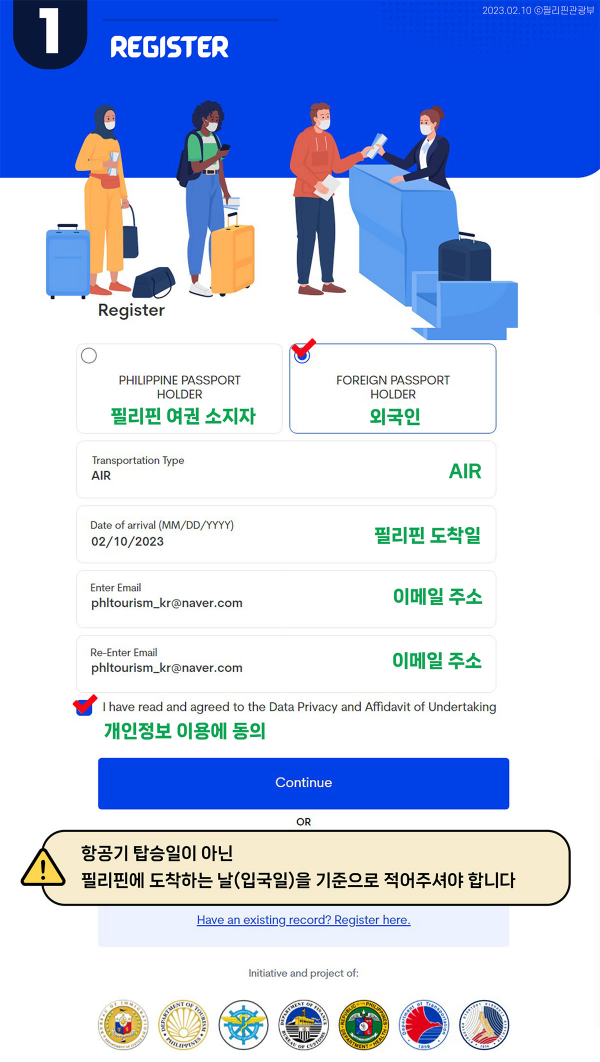 ① Register: FOREIGN PASSPORT HOLDER 선택 후 필리핀 도착일과 이메일 주소 입력. 개인정보 이용에 동의
